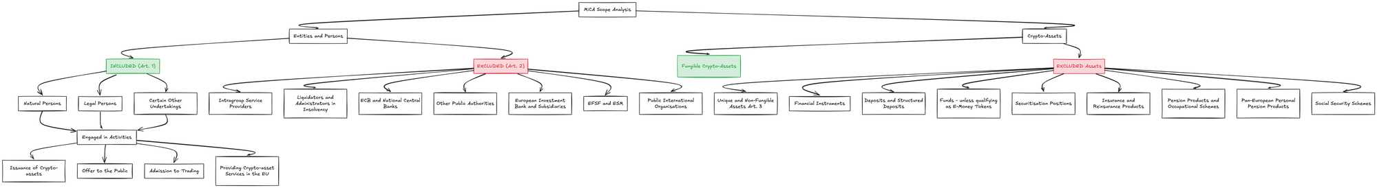 Below is a high-level map of MiCA's scope under Article 2 (who and what falls in, and what's excluded).